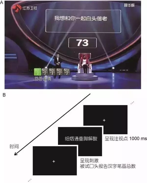 “扒鸡大妈”赵淑芳在《最强大脑》中的表演项目(A)及实验研究中的主要实验流程(B)除了对常见汉字笔画的学习与记忆外,实验结果表明被试也会采取一些策略来帮助计算汉字的笔画数目。值得注意的是,在实验中发现被试计算加法的心算速度明显高于控制组,而这一心算能力一方面能帮助他们在使用策略时更快地得到汉字部件的笔画数之和,另一方面也可以帮助他们更快地完成多个汉字的数笔画任务。