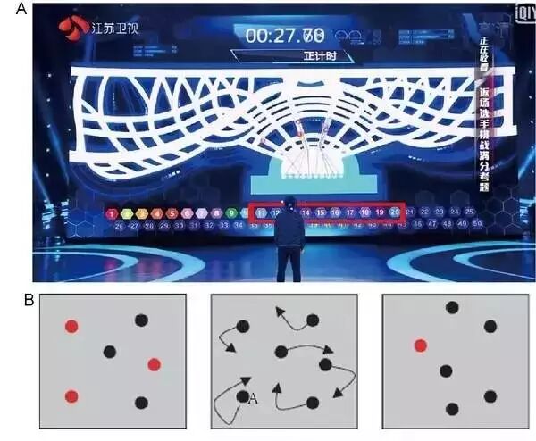 苏清波在《最强大脑》节目中的挑战项目“奔跑的力量”(A)及多客体追踪研究中的经典范式(B)在日常生活中,人们常常需要同时关注和追踪多个物体。足球运动员必须追踪队友和对手的跑位,以及球的位置;警察需要同时追踪人群中多个个体的行动,找出潜在的安全隐患。近30年来,科学家针对多客体追踪背后的心理机制做了大量探索,发现了一些行为及脑成像方面的规律。