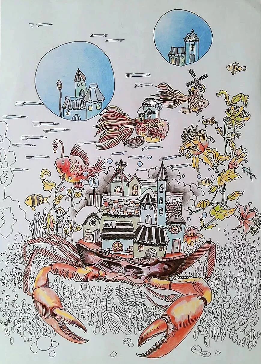 上面这张螃蟹画,是张普通的画。我运用‘像什么’进行想象。螃蟹吐的泡泡像个地球,于是我在泡泡里画了很多房子。(下图)