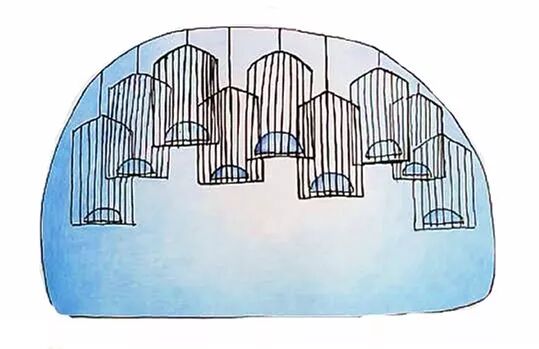 由笼子,想到鸟,鸟嘴里叼着笼子,笼里有一颗水滴。我们是否可以继续想:鸟在水滴头的世界是什么角色呢?…可以根据画面已有的信息,无限地去想未知信息。