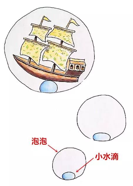 我想象:水滴上有艘大船。好像水滴上不可能有艘大船,那么,我们就把‘不可能’作为信息,想象下一幅不可能画面。