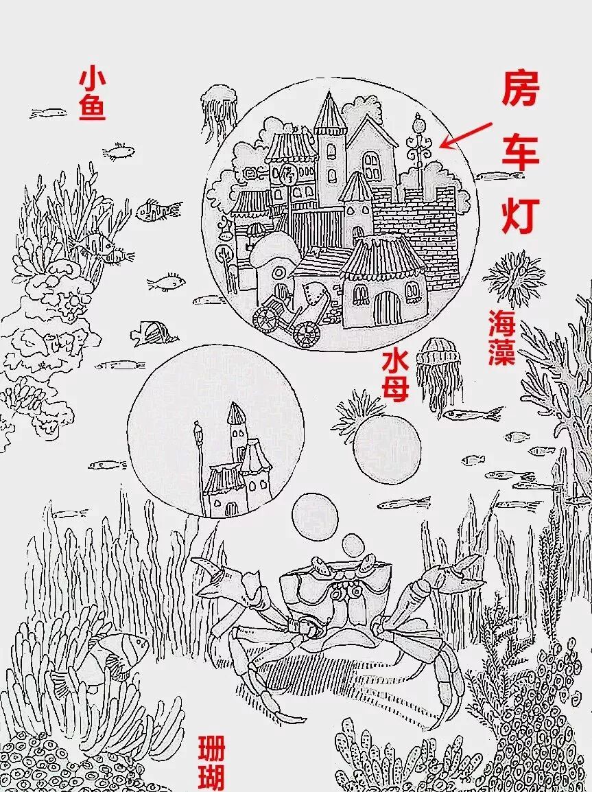 7岁要达到第2阶段,把螃蟹和房子分别展开,收集信息。由螃蟹可以想到:鱼,珊瑚、海藻…,由房子想到:不同房子、车、路灯…下图