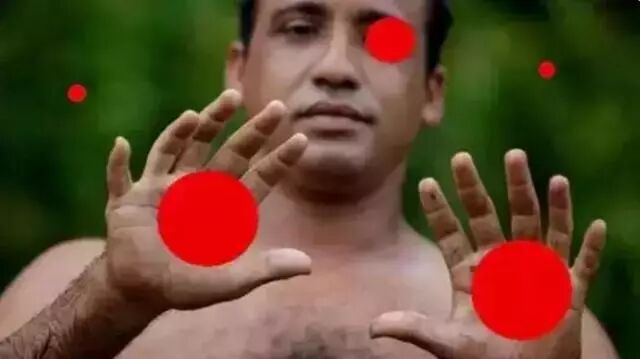 图中的12指男人是来自于古巴的Yoandri Hernandez Garrido,他每个手都有6个手指头,每只脚也各有6个脚趾。如果我们一开始不提红球的事情,相信每个人都会马上注意到这个奇人的存在。