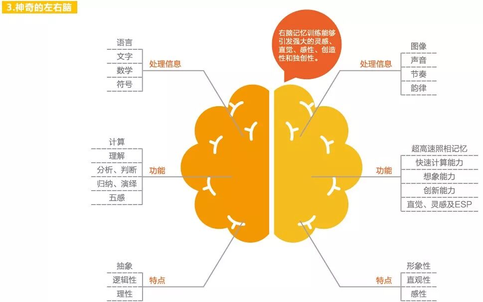 2.右脑是蕴藏着巨大潜能的区域,是创造力爆发的区域,里面蕴藏着无限可能。它不但有超强的记忆能力又有高速的信息处理能力,右脑发达的人会突然爆发出一个想法、一条思路、一个小小的发明。