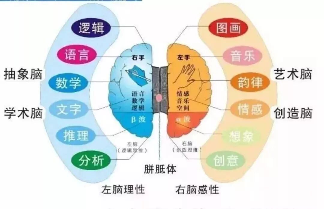 左脑是人的“本生脑”,记载着人出生以来的知识。管的是近期的和即时的信息,右脑则是人的“祖先脑”,储存从古至今人类进化过程中的遗传因子的全部信息。很多本人没有经历的事情,一接触就能熟练掌握就是这个道理。