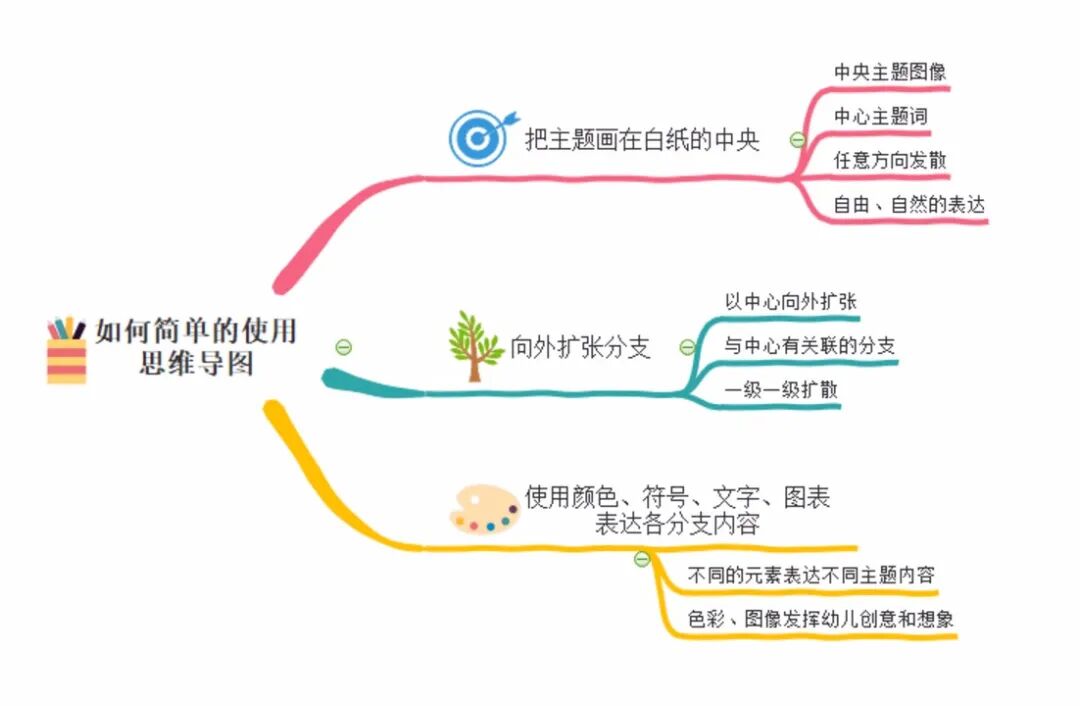 每一条主线用一个概括凝练的关键词,因为一个关键词会让条理更清晰,思维空间更灵便。每条主线的关键词也建议用图画的形式,如果还有三级、四级等分支,考虑到空间是否充足,可以用词语。一般学龄前儿童的思维导图都是二级或者三级,而且考虑到孩子识字有限,建议都用图画或者形状。
