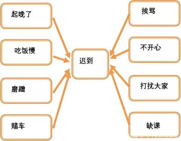 多重流程图又叫复流程图,它可以找到事件发生的原因和导致的结果。这种图相对要复杂一些,建议孩子上小学后再用。像这样表示迟到的原因和结果▼