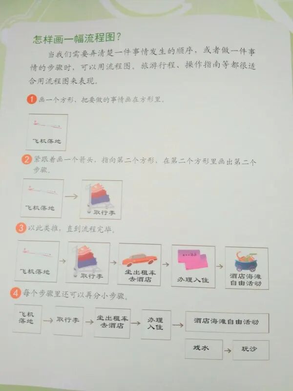 流程图也是非常常见的一种图。它表示事件的顺序、步骤、过程等。这种图非常锻炼小朋友的逻辑思维。