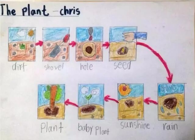 比如:一个孩子画的的关于种胡萝卜的流程图就很有棒!