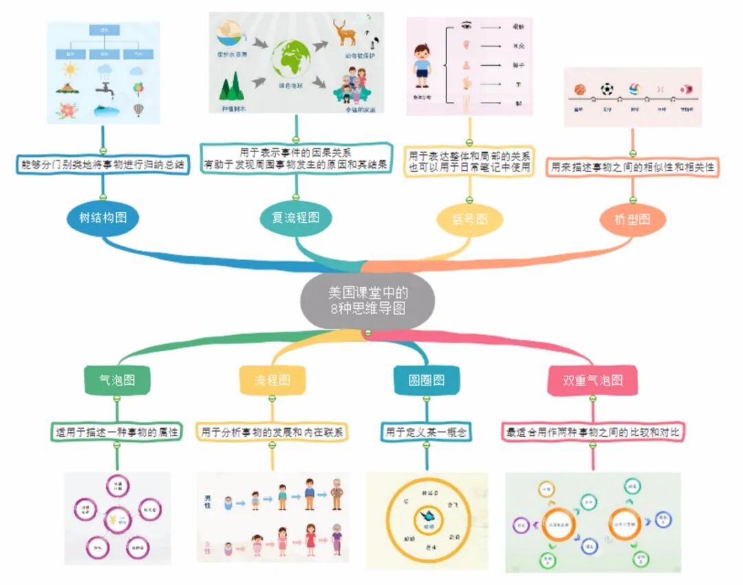 圆圈图、树结构图、括号图、桥型图、气泡图、双重气泡图、流程图、复流程图。以下是我整理的这八种思维导图介绍,爸爸妈妈们可以在家引导孩子学习。
