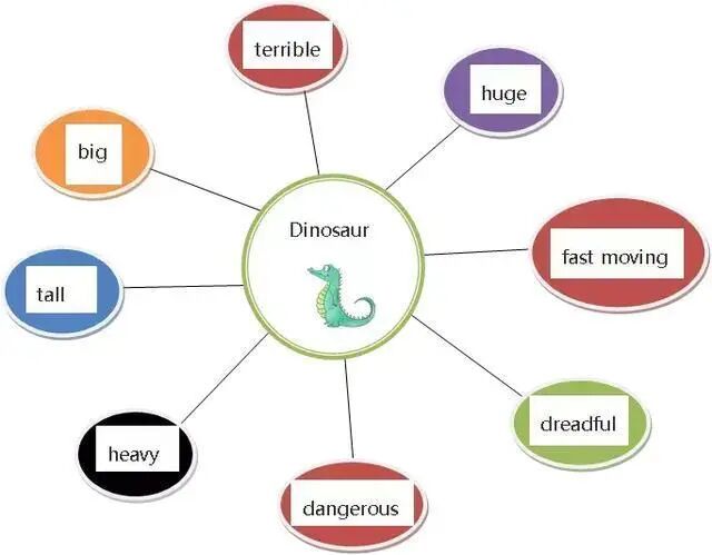 比如下面这个恐龙的气泡图,通过恐龙 dinosaur,可以联想到很多关键词,而这些词都可以听过气泡图清清楚楚地展示出来,爸爸妈妈们可以带宝贝们画一下,真心实用又一目了然。