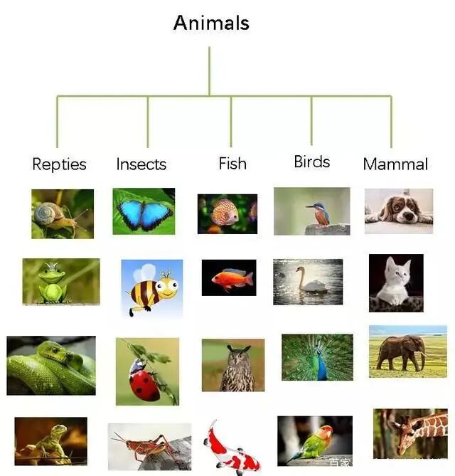 树状图就像一棵大树,主题是树根,类别是树枝,项目是树叶。树形图用来分类或分组,帮助整理思维。比如下图,给动物的分类。如果家里有打印机的就比较占优势了,可以将图片打印下来,然后让孩子直接往上粘贴,做出来的生动又漂亮。