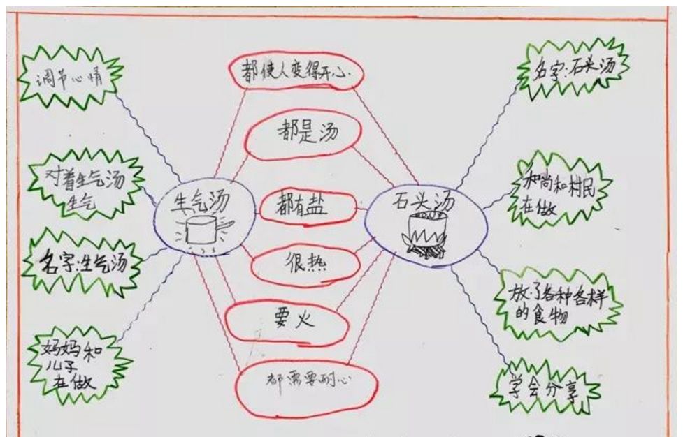 在练习双重气泡图的过程中,我们也可以从类似绘本入手,比如《石头汤》和《生气汤》的对比,由浅及深,纵连横连,慢慢推进。