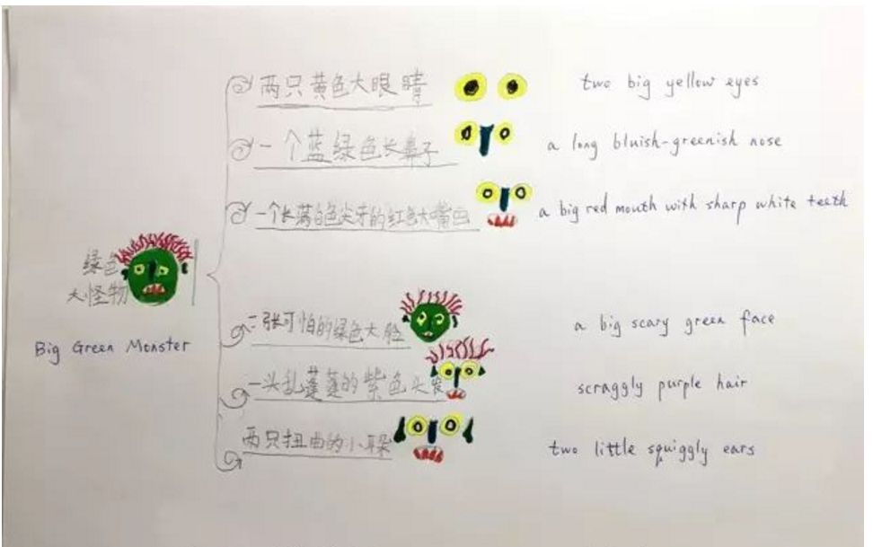 括号图我们都非常的熟悉了,应该做笔记的时候都用过。它用来表示整体与部分的关系,不过,这种对于小朋友来说可能还有些难,需要家长和孩子一起操作,多练几次,就能轻松上手了。我们用括号图方法做一个大家熟悉的绘本《走开,绿色大怪物》的思维导图。绘本向孩子们展示了有趣的,黄色大眼睛、蓝绿色长鼻子、红色大嘴巴、可怕的绿色大脸、乱蓬蓬的紫色头发、扭曲的小耳朵,巨大的绿色怪物……