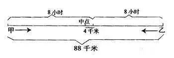 再如,甲乙两人同时从相距88千米的两地相向而行,8小时后在距中点4千米处相遇。甲比乙速度快,甲、乙每小时各行多少千米?