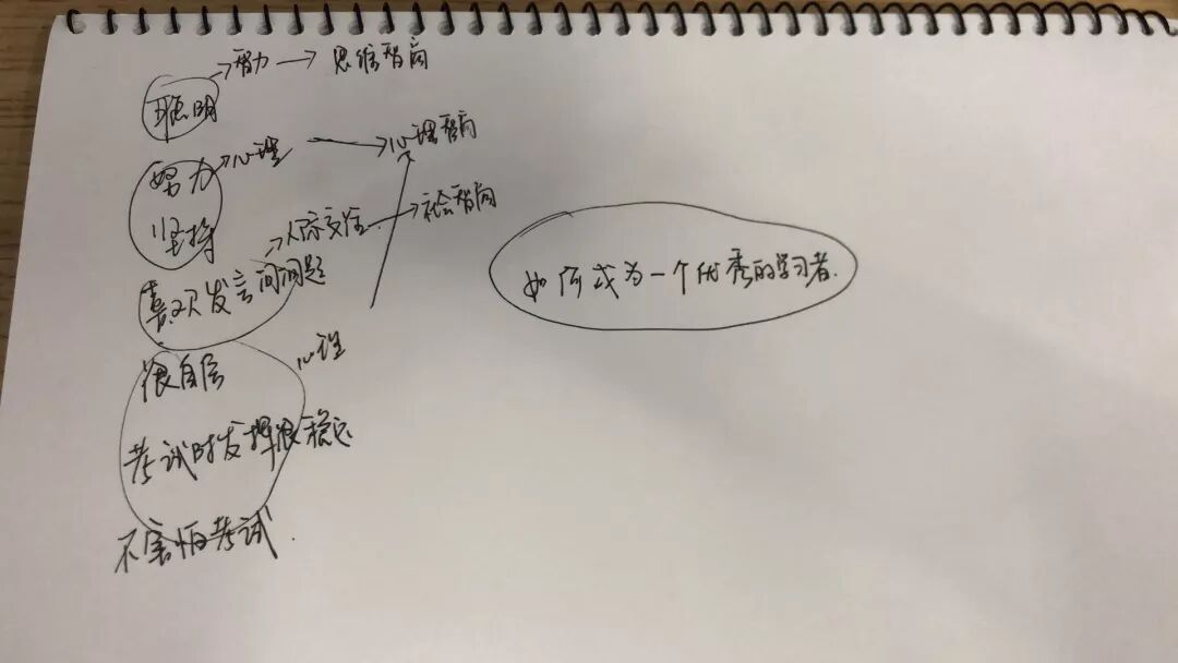 找一张大白纸,在纸的中心画出思考内容的中心内容,然后围绕中心点展开联想。此时你可以在白纸的中心画上一个大圈写上“优秀的学习者”,然后展开联想。