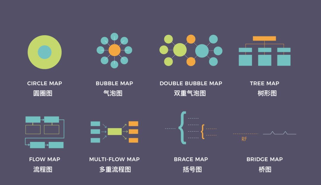 第二类,思维图 (Thinking Maps), 是美国的教育博士David Hyerle 发明的,其中包括八种不同的图形,每种都有不同的作用,代表了不同的思维过程。