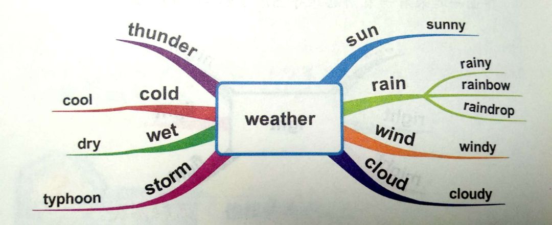 ① 按照食物、动物、颜色、地点、天气等进行归类;比如以天气为中心单词进行整理。