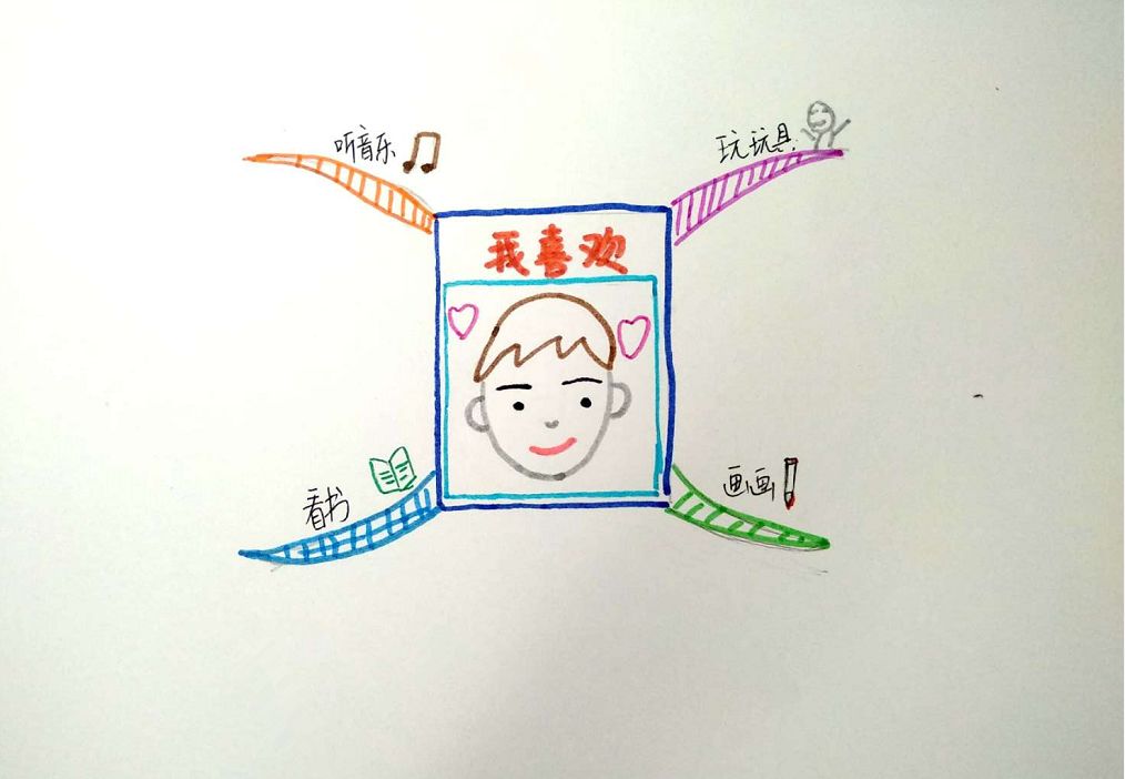 (1)中心图:先在纸的正中央,画一个大概占画面的1/9(差不多一个身份证那么大),代表主题内容的中心图(孩子画放方形难的话,也可以画圆圈)。