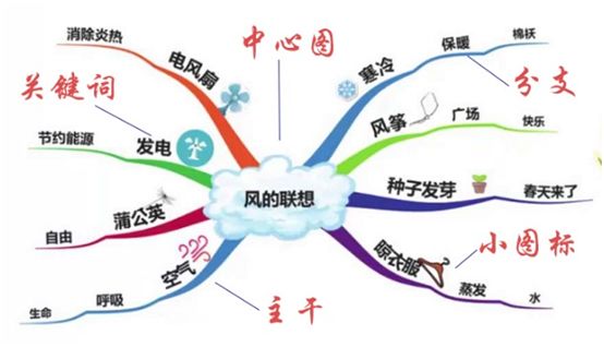 整个图主要由中心图、主干、分支、关键词、小图标五大要素构成。