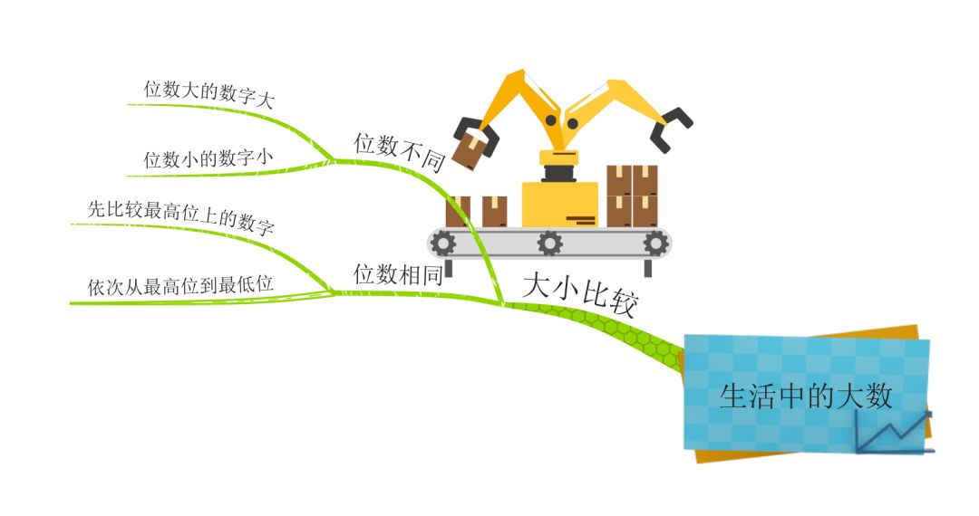 在进行大数比较时,先通过数位数,确定是否是相同位数的数字,如若位数不同,位数大的数字相对更大些。在位数相同时,先比较最高位上的数字,再依次从最高位到最低位。结合具体情境,发展我们的估数意识和估数策略。