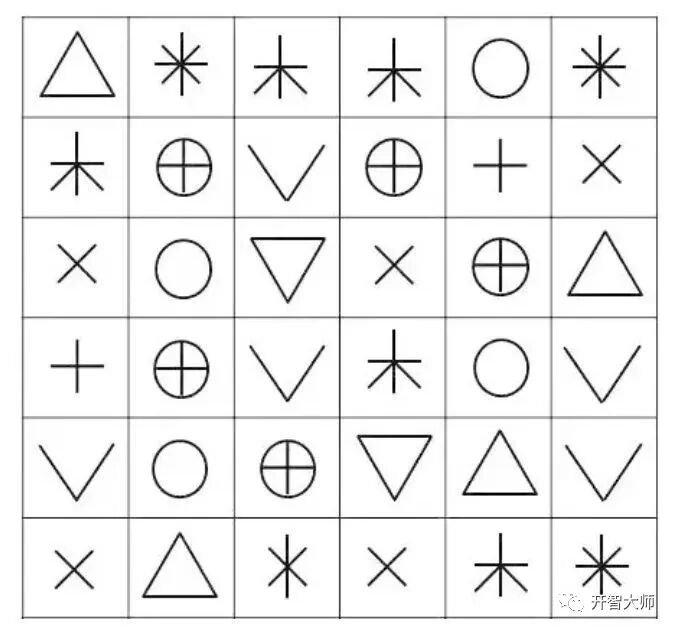 做好之后让孩子看30秒,记住不同形状所在的位置。接着再给孩子一张只有格子没有图案的纸,让孩子把图案画到相应的格子里