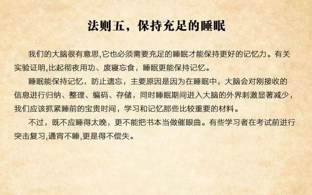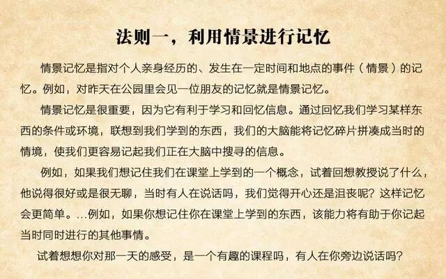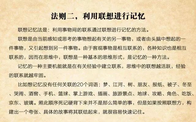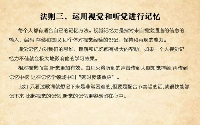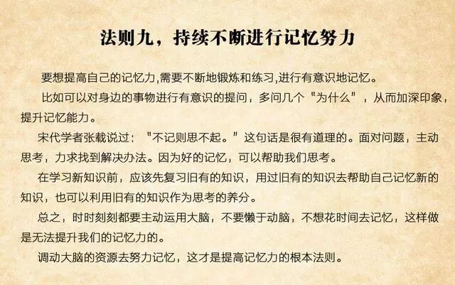 想要提升你的记忆力,想要掌握记忆这两个特性。然后在这个基础上,再按照下面九个记忆法则,相信你就能大大改善你的“记不好”的问题。