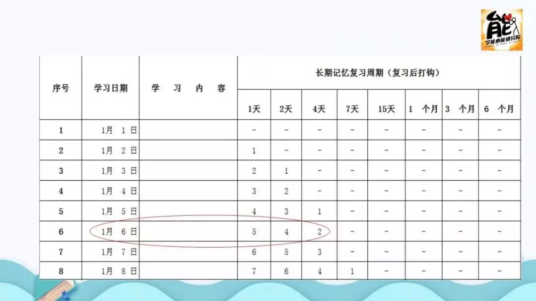 这么听起来,好像每天要复习很多东西,但其实并不是,我们看到第6天只需要复习第5、4、2天所学的知识。因为根据规律,第三天和第一天的他是不需要在第6天进行复习,所以并不是每天都要复习所有的知识点。