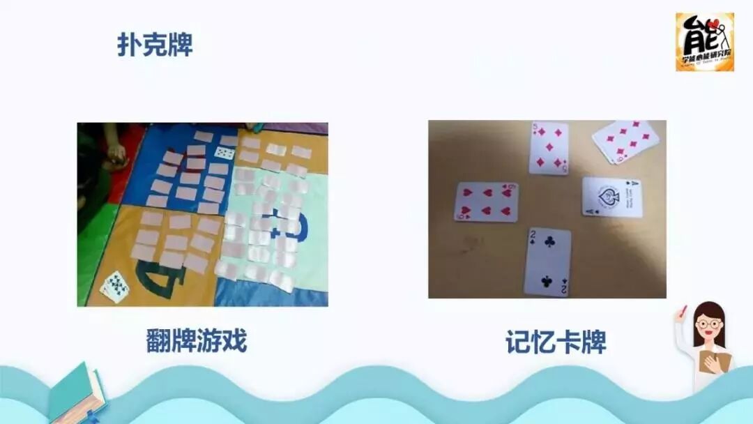 第一个是扑克牌记忆法,随机抽出几张牌,给孩子十秒钟的时间让他记忆,最后看他记得多少,扑克牌的数量在之后逐次增加。