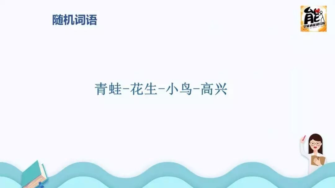 第三个方法是随机词语法。家长从一堆词语卡片里随机抽4-5个,由家长先报一遍词语:如,青蛙-花生-小鸟-高兴, 让孩子回忆是哪几个词语。再用4个词语组成一句话,例如青蛙看见花生叫来了小鸟,他们很高兴。让孩子重复这句话,再背出4个词语。这就是把词语串联起来变成一个故事,这种方法叫做串联记忆法,不仅可以培养孩子的记忆力,还可以训练他们的想象力、创造力。