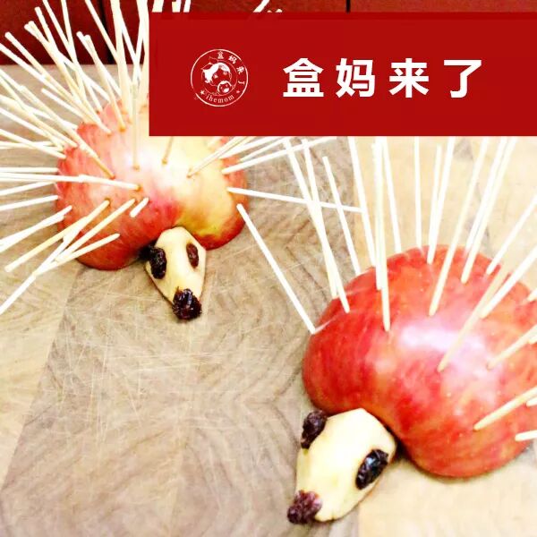 这么霸气的刺猬是用苹果+面团+葡萄干+牙签制作而成的,在游戏中要提示孩子不要将牙签插在一起,要保留一定的间隔,这样才能达到训练的目的哦。