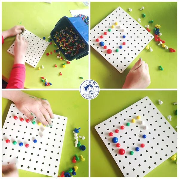 让孩子仔细观察妈妈摆放的形状是什么,在纸板孔的第几行、第几列使用的暗扣?每个洞又是使用什么颜色的暗扣?……