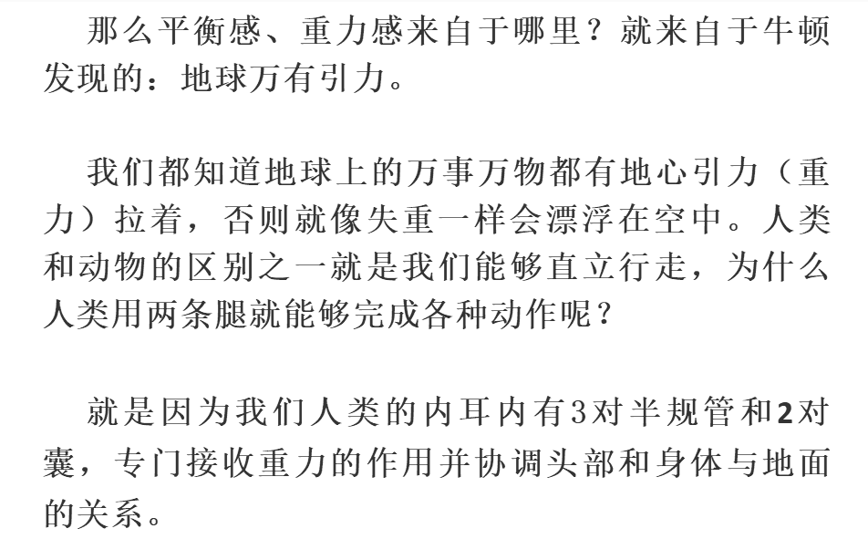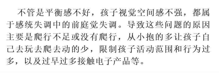 孩子从抬头、翻身、坐、爬、站,走、跑、跳,一直都是挣脱地心引力束缚的过程,也是锻炼自身平衡感的过程。平衡感不好的孩子,做不了高难度的、复杂性的活动,甚至坐在凳子上都不一定能坐稳,就是因为他们没有挣脱地心引力的束缚,不能自如的和重力协调关系,因此在他做游戏时或听指令完成动作时,他首先要掌握自身的平衡才能分心去思考当前的任务或老师下达的指令。