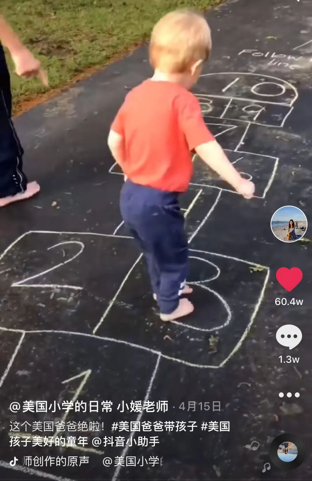 这也是为什么,最近这条爸爸带娃玩“粉笔游戏”的视频,在抖音上刷爆了,获得60万+的赞。大家在惊呼这个游戏让我们找到“童年模样”的同时,也为这位美国爸爸的耐心与爱心竖起大拇指!