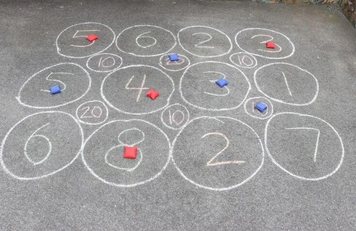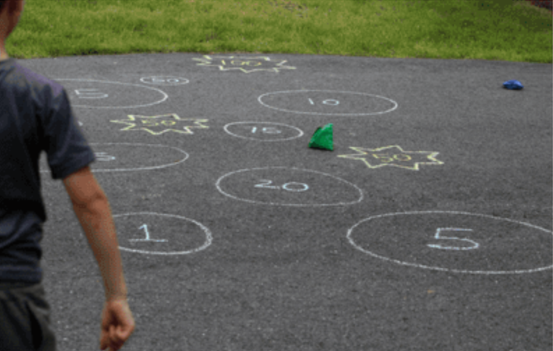 扔豆袋:绘制一系列目标,并根据起点的大小和距离为它们提供各种点值(距离越远,目标越小,点数越多),请小朋友们扔豆袋子并计算他们所得的分数,这个游戏形式家长们也可以参与进来,与孩子们进行计数比赛。