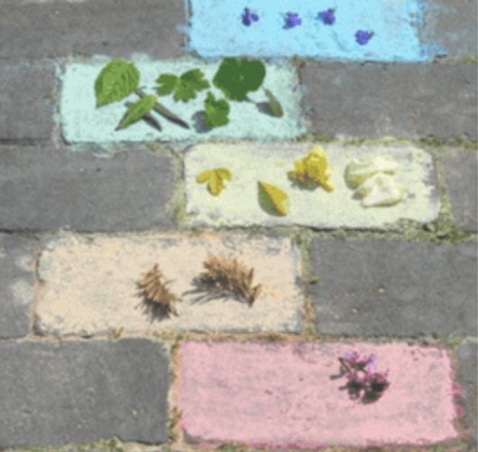 对于年幼的孩子,可以保持简单点,让他们去大自然中寻找与粉笔颜色相匹配的物品,给他们讲讲各种各样的植物。