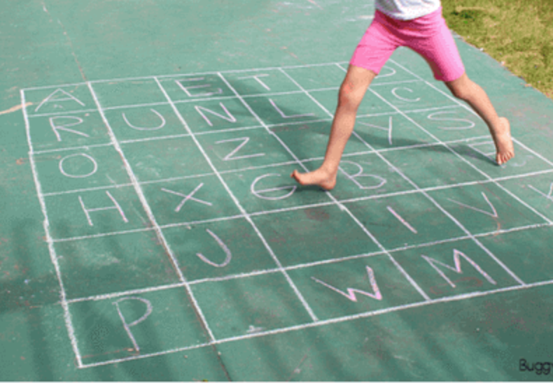 在地上画一个简单的字母网格,孩子按照26个字母的顺序像踩音符一样跳来跳去,别提多欢乐!
