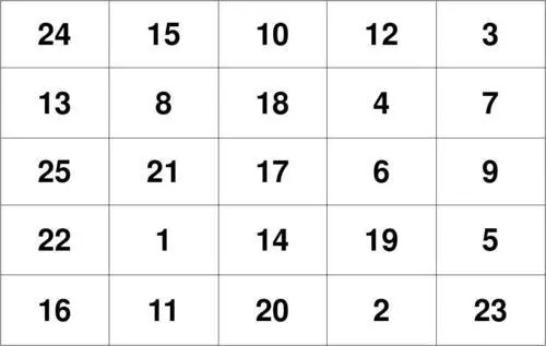 舒尔特方格是在一张方形卡片上画上1cm×1cm 的25个方格。训练时,要求被训练者用手指按1-25的顺序依次指出数字的位置,同时诵读出声,父母帮助孩子计时。按照顺序数完25个数字所用时间越短,表示孩子的注意力水平越高。