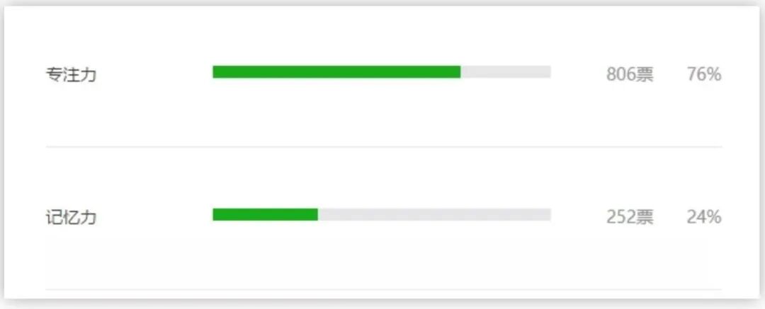 看看在实际生活中,家长们对孩子的专注力有多重视,这是网上调研“你最关心孩子哪种学习能力”中家长们的投票。