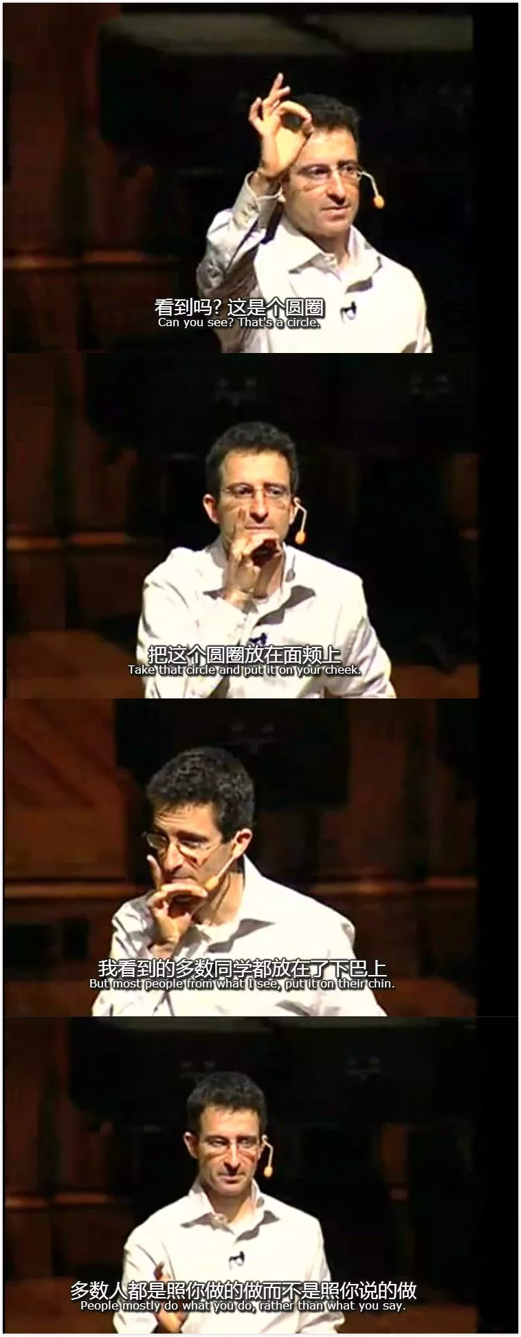 这个游戏告诉我们,大脑在处理信息的时候,会优先选择视觉类信息。(就像TalBen Shahar所说的那样,多数人都是照你做的做,而不是照你说的做)