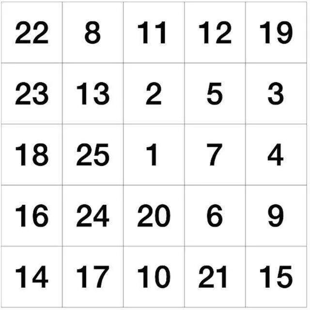 是:在一张有 25 个小方格的表中,将 1 — 25 的数字打乱顺序,填写在里面,然后