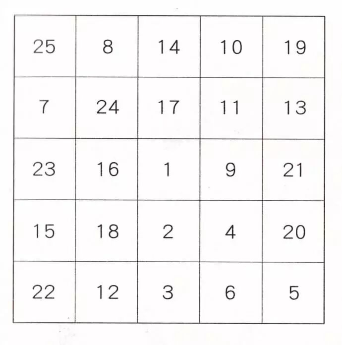 这里给大家介绍一种在心理学中用来锻炼注意力的小游戏。在一张有25个小方格的表中,将1-25的数字打乱顺序,填写在里面(见下表),然后以最快的速度从1数到25,要边读边指出,同时计时。
