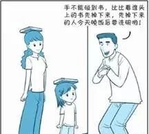 (2)然后放一本书在他头顶上,告诉他不要动,动一动书掉下来,那可就输了。妈妈或爸爸也拿一本书顶在头上,站在孩子旁边,看表开始计时,并说明规则:“手不能碰到书,比比看谁头上的书先掉下来,先掉下来的人今天晚饭后要洗碗哟!”