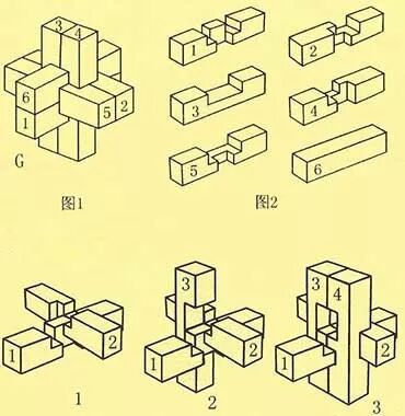 6根短木分别冠以六艺,中间有缺,以缺相合,作十字双交形。他儿子忙碌了一夜才终于拆开。