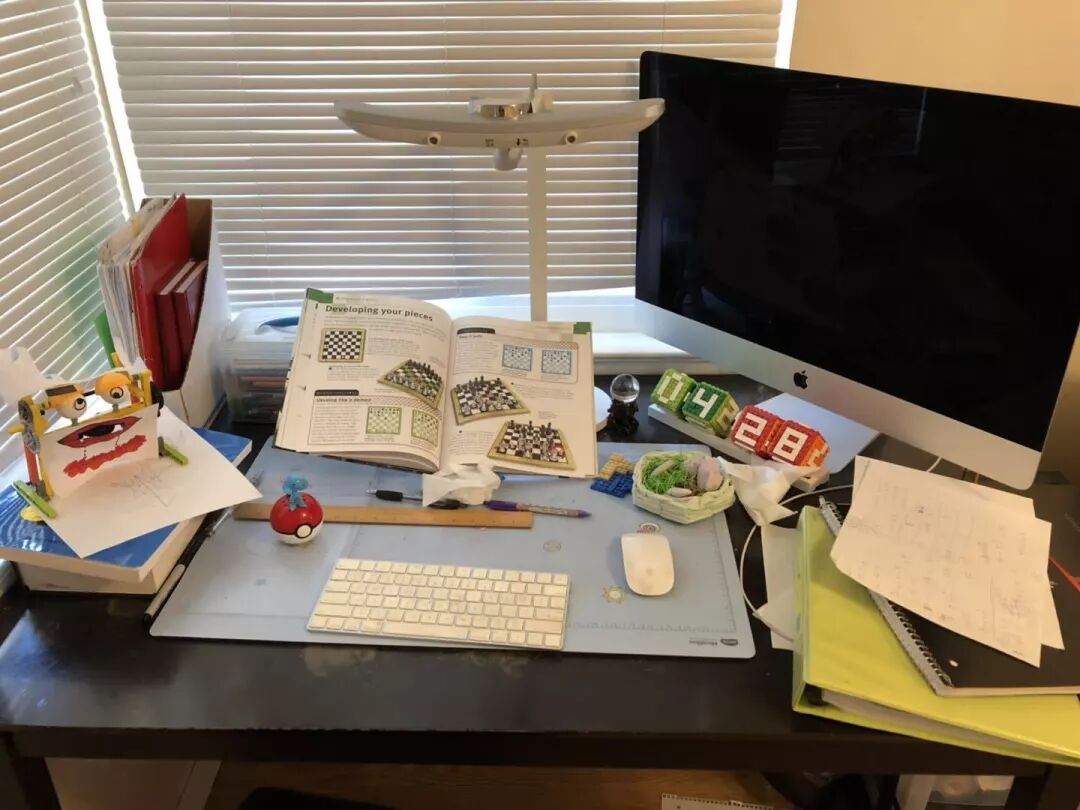 我首先发现的问题是学习环境。下面这张图是我儿子之前的书桌,有乐高、有Pokemon、有手工作品、还有国际象棋的书...
