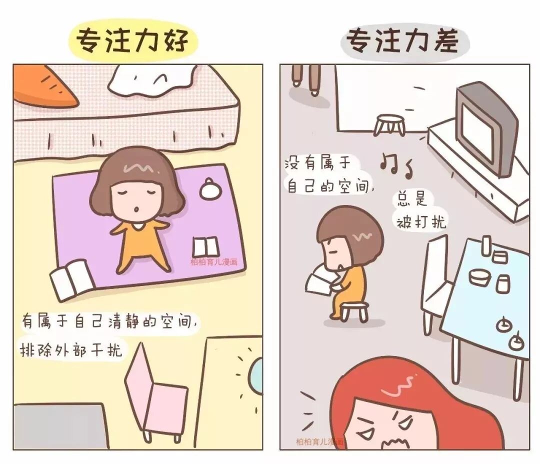 对孩子来说,还无法用自己的意志克服外界干扰,所以要给孩子一些清静的空间,每天让ta在自己的小世界里,玩会儿玩具也好,想想心事也好,安安静静地待几十分钟也是锻炼ta专注力的方式。孩子在学习的时候,与学习无关的东西最好全部清理掉以排除干扰。