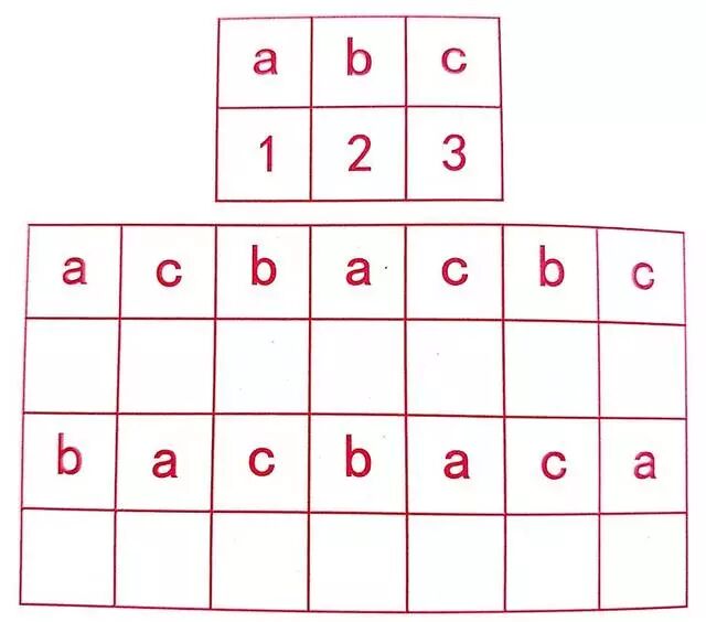 a、b、c相对应的数字1、2、3让孩子记住之后把下列的空填上对应的数字,孩子完成之后可以把训练升级一下增加字母和数字的个数,在进行相应的填空。