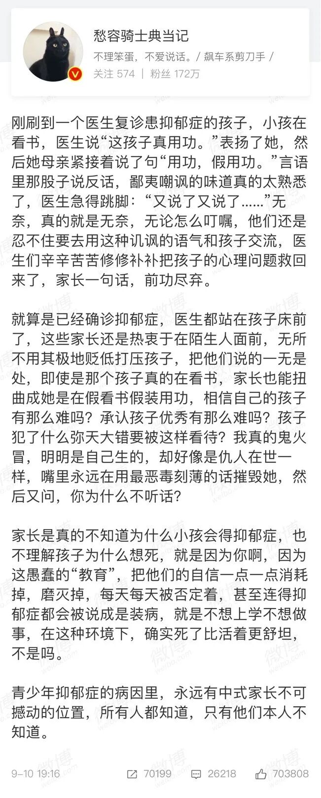 一个孩子患上了抑郁症,去复诊的时候正好在看书。医生看见了,便表扬她:“这孩子真用功。”