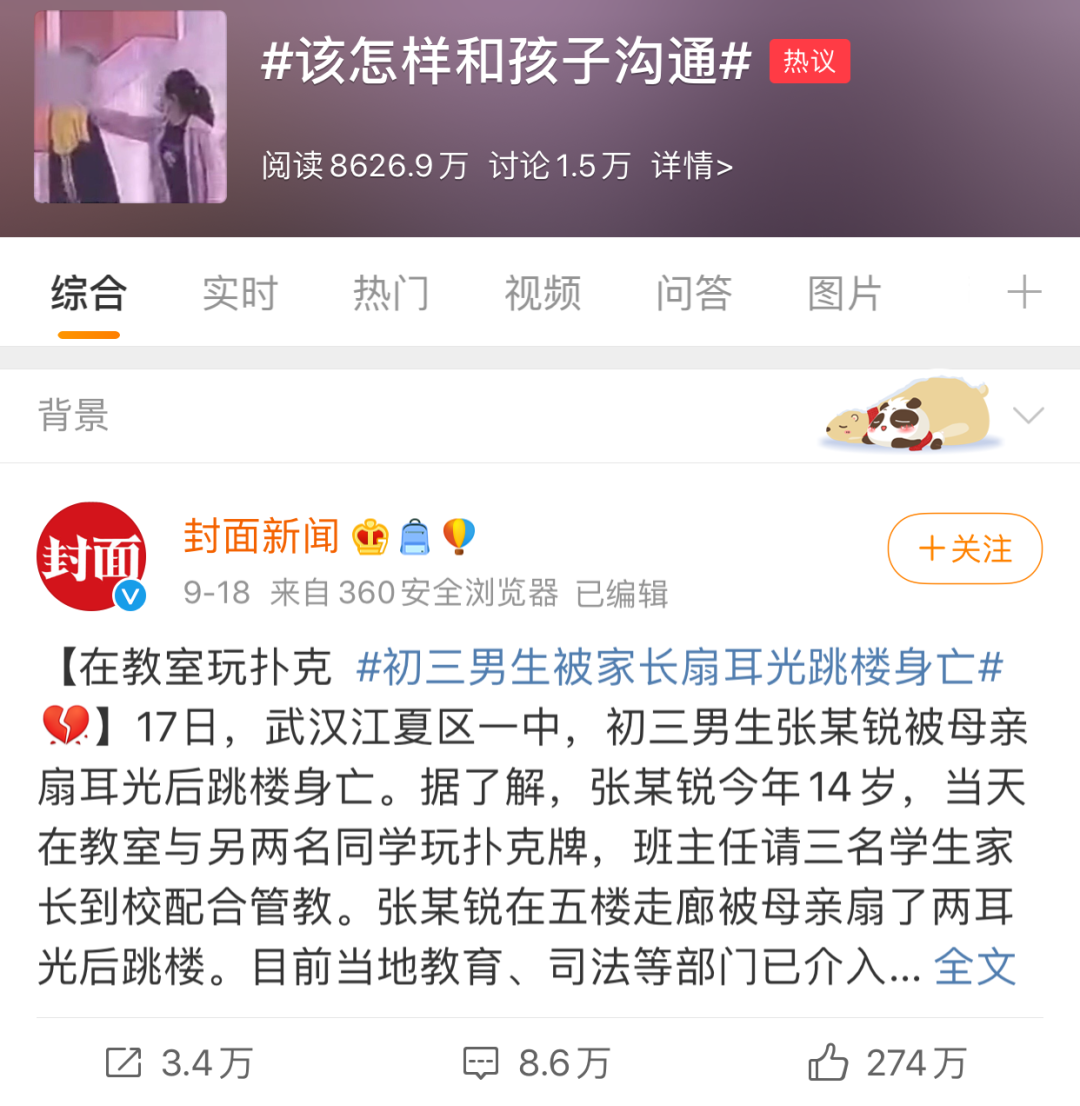 前两天,有一则#初三男生被家长扇耳光跳楼身亡#的新闻,上了微博热搜。