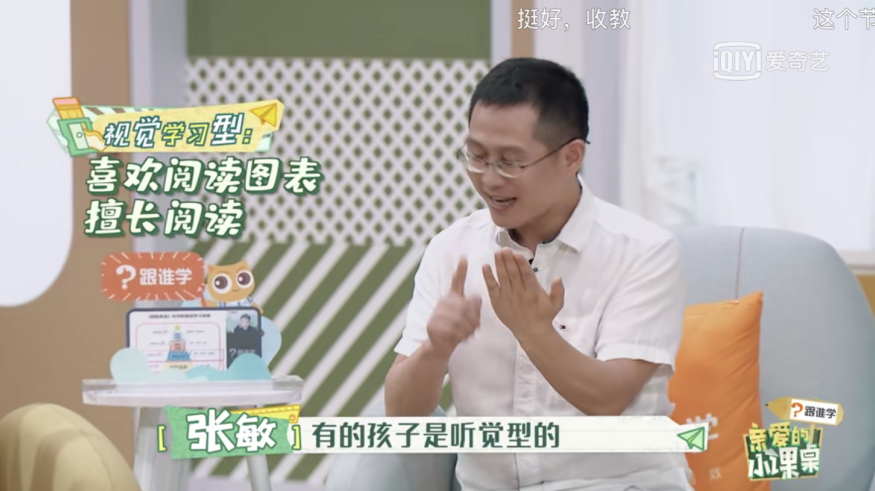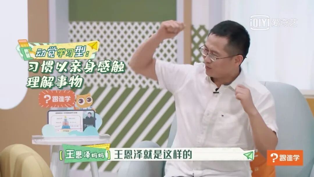 有的孩子背课文喜欢一边读出声,一边来回走动,比如王恩泽小朋友,他就属于动觉型;比如节目里的希希小朋友,灵动可爱,跳舞的时候特别起劲,她也偏向于动觉型。